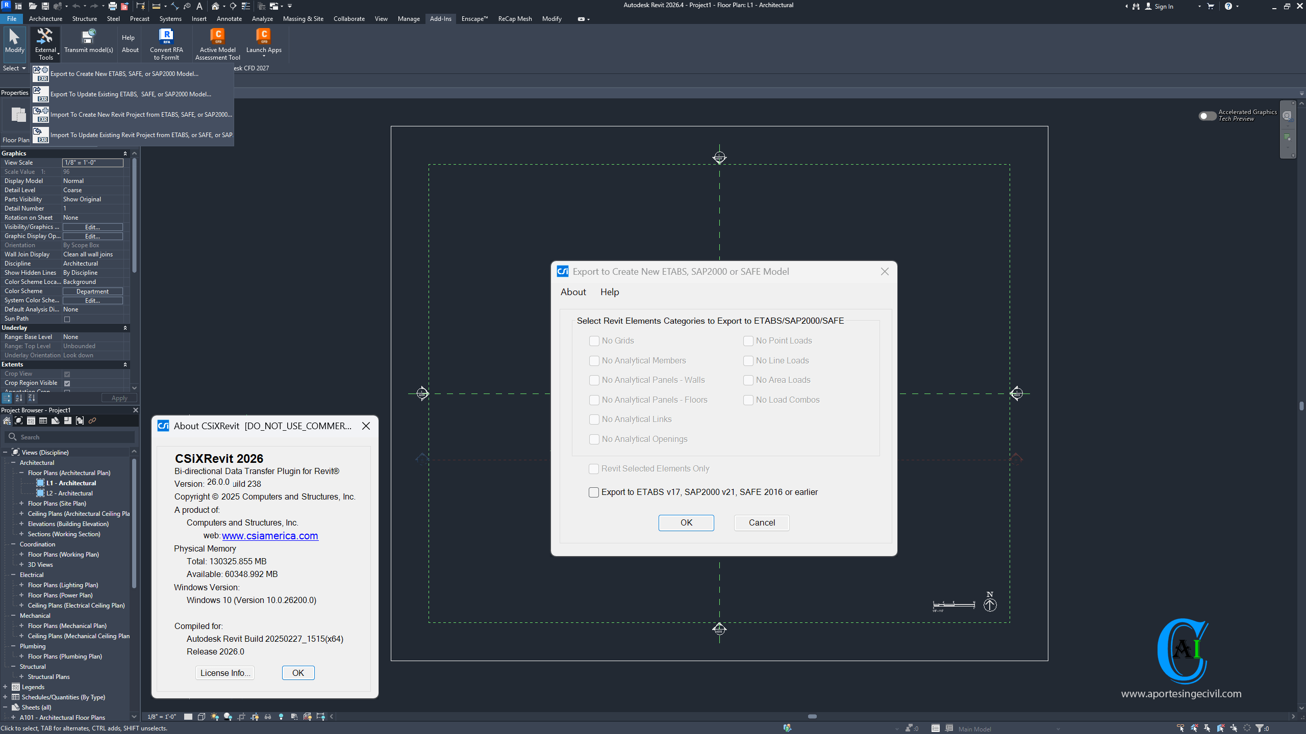CSixRevit 2026 es un plugin o complemento que permite el intercambio de información entre Autodesk Revit y los productos CSI (Sap2000, Etabs y Safe).